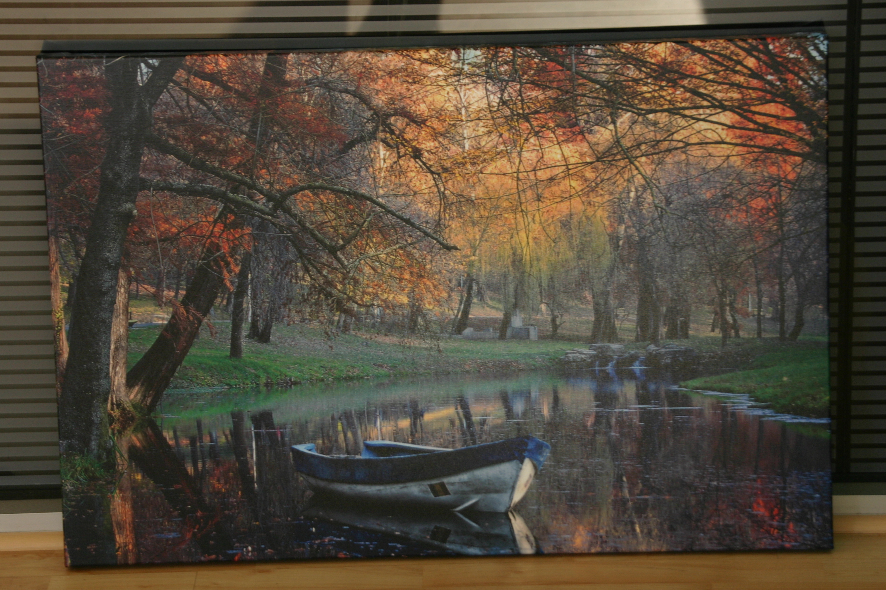 Canvas prints are a great accent or decoration for a wall, we have thousands of stock images to pick from or we can print something of yours. Our standard framing is a 1.5” thick wood frame with the image wrapped around to the back. We also seal canvases with a gloss protectant.